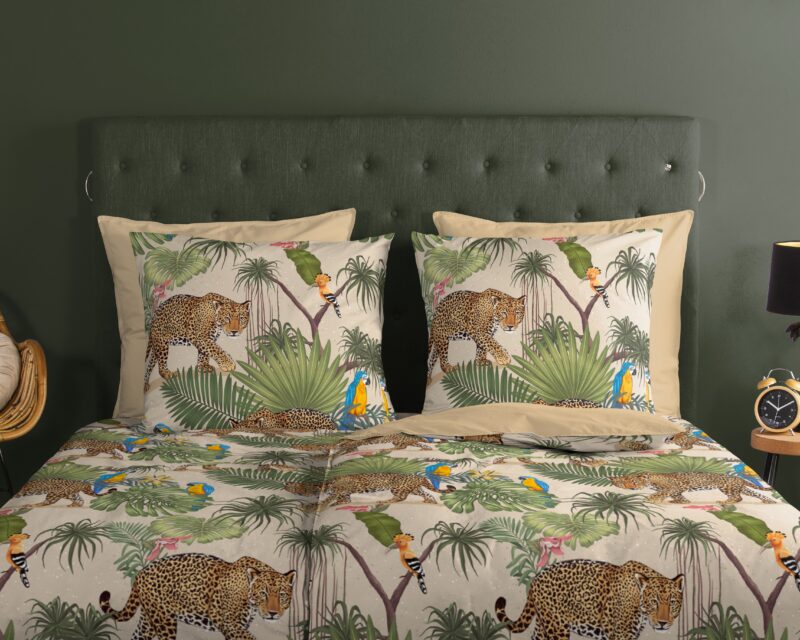 Dekbedovertrek “Tropical” van Good Morning met luipaard met bladeren, in de kleur “Zand” is gemaakt van 100% katoen. Deze kwaliteit is ademend, vochtabsorberend en voelt zacht en soepel aan. Dit mooie dekbedovertrek fleurt iedere slaapkamer op en is geschikt voor ieder jaargetijde. Het katoenen dekbedovertrek is heerlijk koel in de zomer en geeft warmte in de winter.