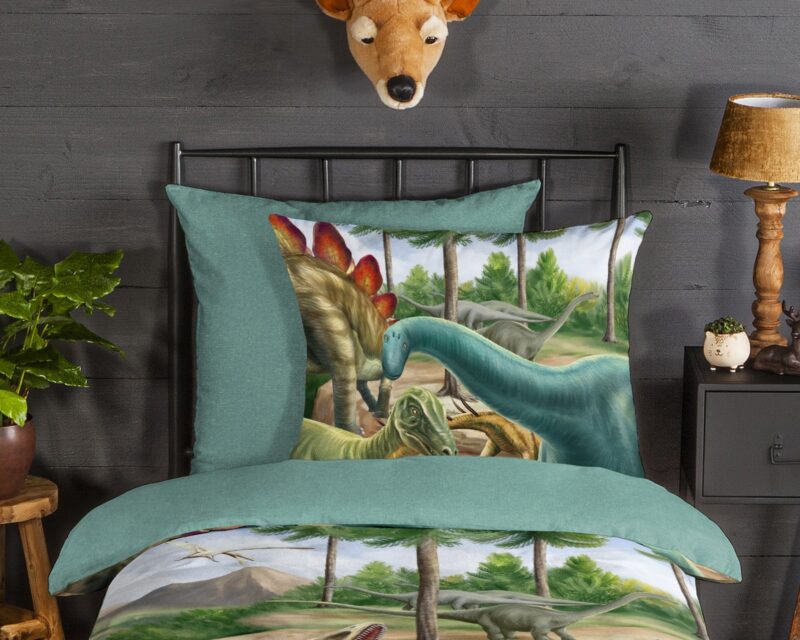 Flanellen Kinderdekbedovertrek “Prehistory” van Good Morning met dinosaurussen, in de kleur “Multi” is gemaakt van 100% geruwde 100% katoen/flanel. Doordat het katoen licht opgeruwd is, ontstaat er een zacht laagje. Deze warme, zachte stof is ademend en vochtabsorberend. Dit leuke kinderdekbedovertrek is een toevoeging aan iedere kinderkamer en is uitermate geschikt voor de koude wintermaanden.