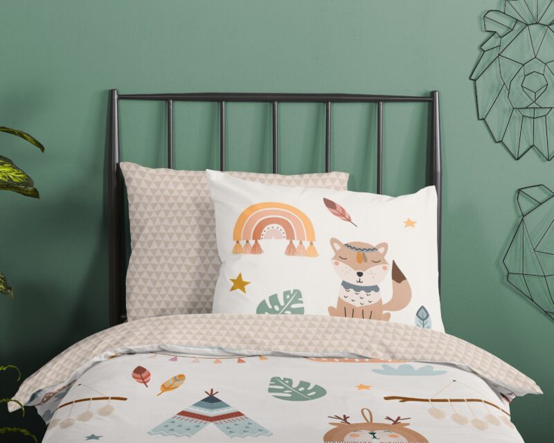 Kinderdekbedovertrek “Remi” van Good Morning met tipi-tenten / boho, in de kleur “Zand” is gemaakt van 100% katoen. Deze kwaliteit is ademend, vochtabsorberend en voelt zacht en soepel aan. Dit leuke kinderdekbedovertrek is een toevoeging aan iedere kinderkamer en is geschikt voor ieder jaargetijde. Het katoenen dekbedovertrek is heerlijk koel in de zomer en geeft warmte in de winter.