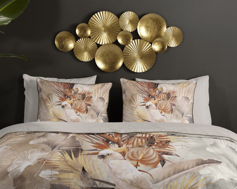 Satijnen dekbedovertrek “Pippa” van Descanso. Dit stijlvolle dekbedovertrek met bladeren en een papegaai, in de kleur “Zand” is gemaakt van 100% katoen-satijn. Descanso dekbedovertrekken zijn luxueus, stijlvol en elegant! Aan de achterkant van een Descanso dekbedovertrek zit altijd een mooie, bijpassende uni kleur. Dekbedovertrekken en kussenslopen van Descanso zijn rondom voorzien van een luxe bies/ piping in een bijpassende kleur. Een Descanso dekbedovertrek geeft een luxe uitstraling aan uw slaapkamer!