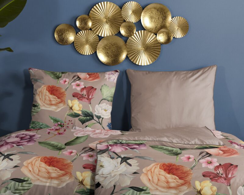 Satijnen dekbedovertrek “Fiori” van Descanso. Dit stijlvolle dekbedovertrek met bloemen, in de kleur “Taupe” is gemaakt van 100% katoen-satijn. Descanso dekbedovertrekken zijn luxueus, stijlvol en elegant! Aan de achterkant van een Descanso dekbedovertrek zit altijd een mooie, bijpassende uni kleur. Dekbedovertrekken en kussenslopen van Descanso zijn rondom voorzien van een luxe bies/ piping in een bijpassende kleur. Een Descanso dekbedovertrek geeft een luxe uitstraling aan uw slaapkamer!
