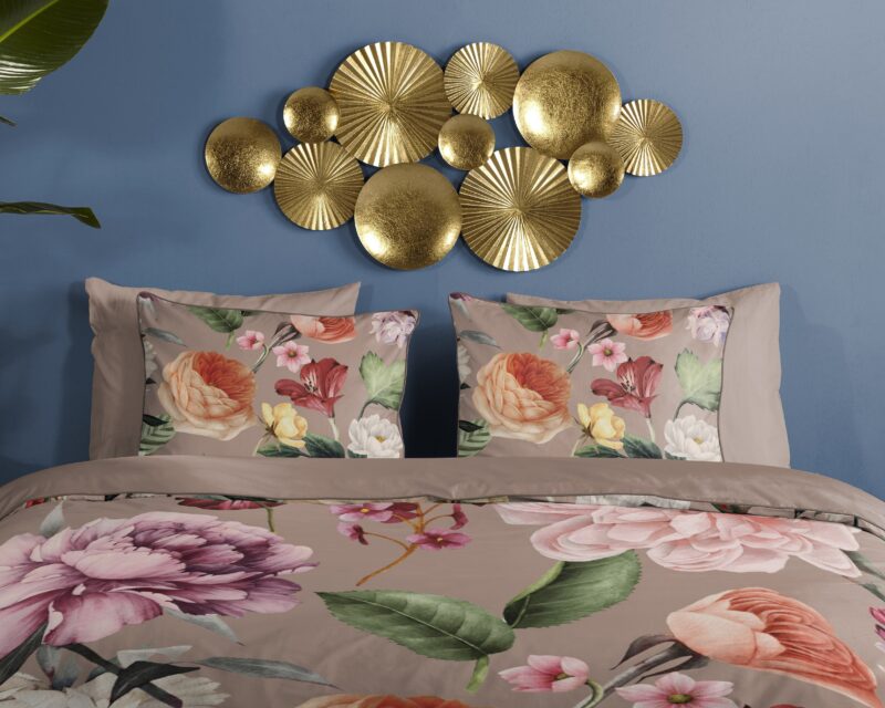 Satijnen dekbedovertrek “Fiori” van Descanso. Dit stijlvolle dekbedovertrek met bloemen, in de kleur “Taupe” is gemaakt van 100% katoen-satijn. Descanso dekbedovertrekken zijn luxueus, stijlvol en elegant! Aan de achterkant van een Descanso dekbedovertrek zit altijd een mooie, bijpassende uni kleur. Dekbedovertrekken en kussenslopen van Descanso zijn rondom voorzien van een luxe bies/ piping in een bijpassende kleur. Een Descanso dekbedovertrek geeft een luxe uitstraling aan uw slaapkamer!