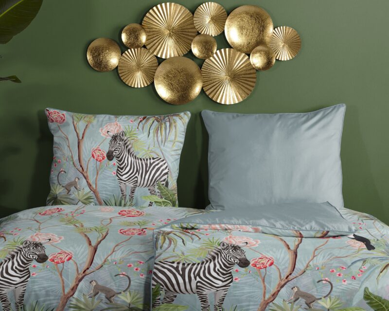 Satijnen dekbedovertrek “Yasmin” van Descanso. Dit stijlvolle dekbedovertrek met jungle print, in de kleur “Aqua” is gemaakt van 100% katoen-satijn. Descanso dekbedovertrekken zijn luxueus, stijlvol en elegant! Aan de achterkant van een Descanso dekbedovertrek zit altijd een mooie, bijpassende uni kleur. Dekbedovertrekken en kussenslopen van Descanso zijn rondom voorzien van een luxe bies/ piping in een bijpassende kleur. Een Descanso dekbedovertrek geeft een luxe uitstraling aan uw slaapkamer!