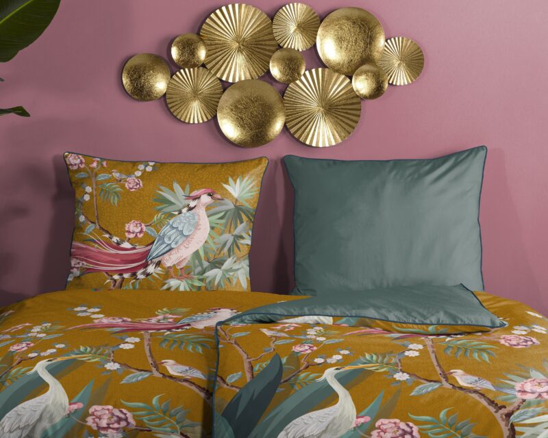 Satijnen dekbedovertrek “Sarenza” van Descanso. Dit stijlvolle dekbedovertrek met kraanvogel met bloemen, in de kleur “Oker” is gemaakt van 100% katoen-satijn. Descanso dekbedovertrekken zijn luxueus, stijlvol en elegant! Aan de achterkant van een Descanso dekbedovertrek zit altijd een mooie, bijpassende uni kleur. Dekbedovertrekken en kussenslopen van Descanso zijn rondom voorzien van een luxe bies/ piping in een bijpassende kleur. Een Descanso dekbedovertrek geeft een luxe uitstraling aan uw slaapkamer!