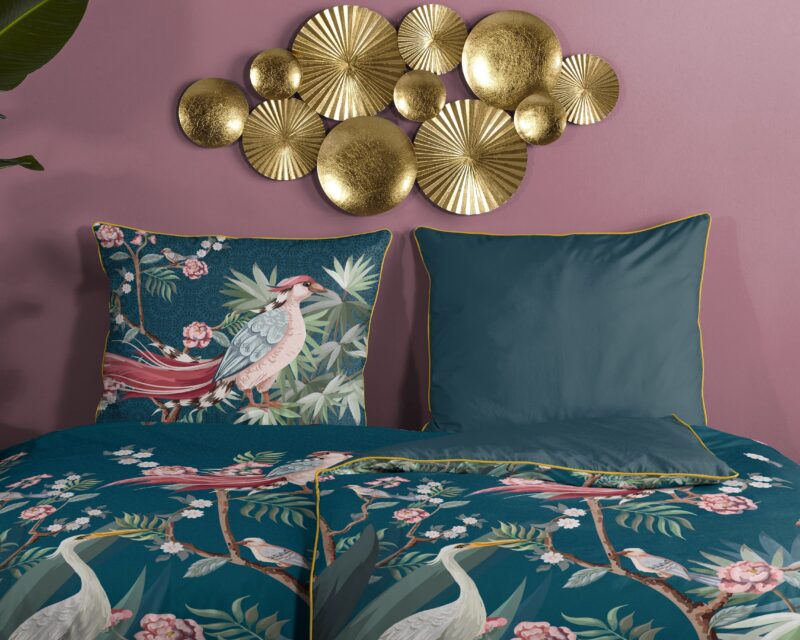 Descanso Dekbedovertrek “kraanvogel met bloemen” – Petrol – (135×200 cm) – Biologisch Katoen satijn