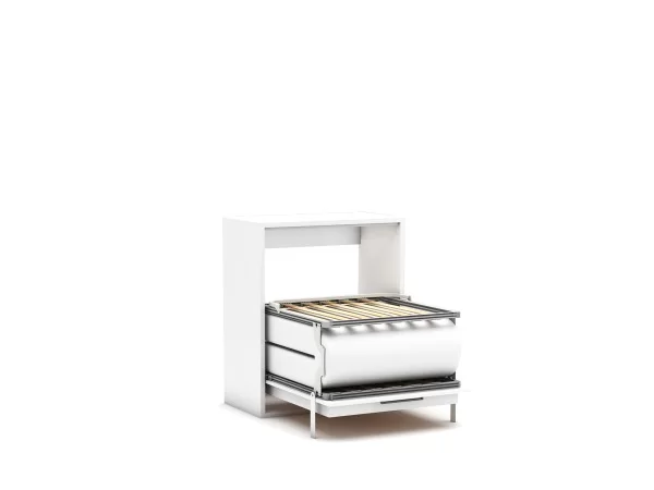 Zeer ruimtebesparend is deze compacte opklapbed genaamd Capsule waaruit een naar voren te openen éénpersoons opklapbed te voorschijn komt. Het betreft een kleine lage stijlvolle kast die relatief klein en dun is omdat de matras in de kast wordt opgevouwen.