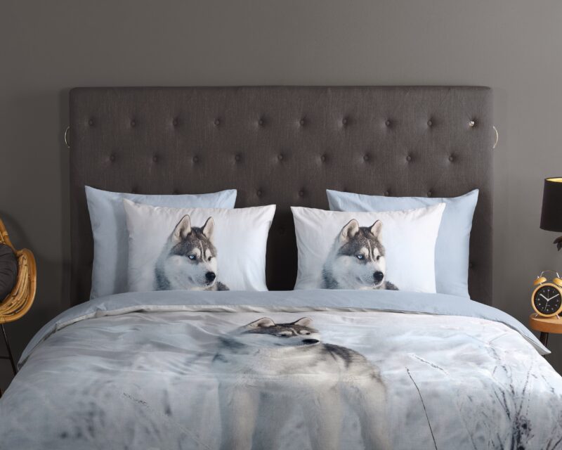 Dekbedovertrek “Sachar” van Good Morning met husky hond, in de kleur “Blauw” is gemaakt van 100% katoen. Deze kwaliteit is ademend, vochtabsorberend en voelt zacht en soepel aan. Dit mooie dekbedovertrek fleurt iedere slaapkamer op en is geschikt voor ieder jaargetijde. Het katoenen dekbedovertrek is heerlijk koel in de zomer en geeft warmte in de winter.