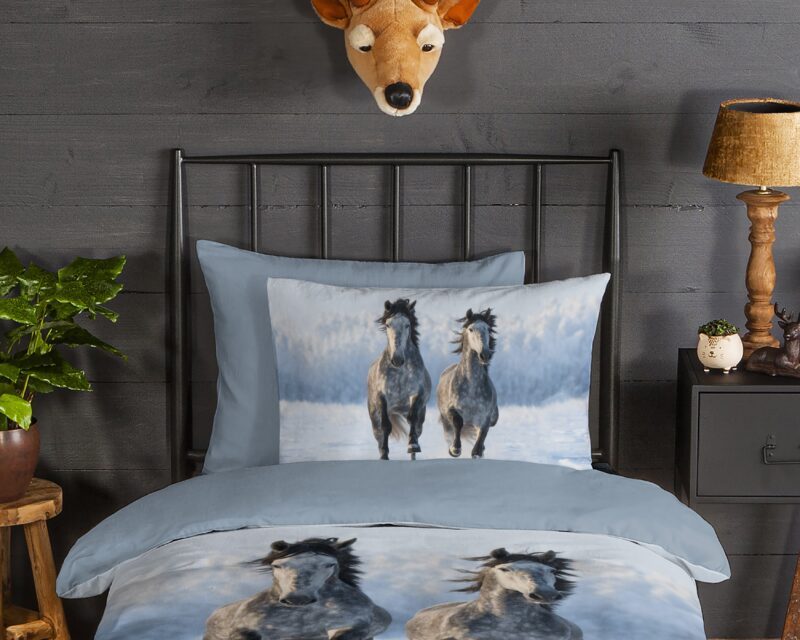 Flanellen dekbedovertrek “Snowhorses” van Good Morning met paarden in de sneeuw, in de kleur “Grijs” is gemaakt van 100% geruwde 100% katoen/flanel. Doordat het katoen licht opgeruwd is, ontstaat er een zacht laagje. Deze warme, zachte stof is ademend en vochtabsorberend. Dit mooie dekbedovertrek fleurt iedere slaapkamer op en is uitermate geschikt voor de koude wintermaanden.