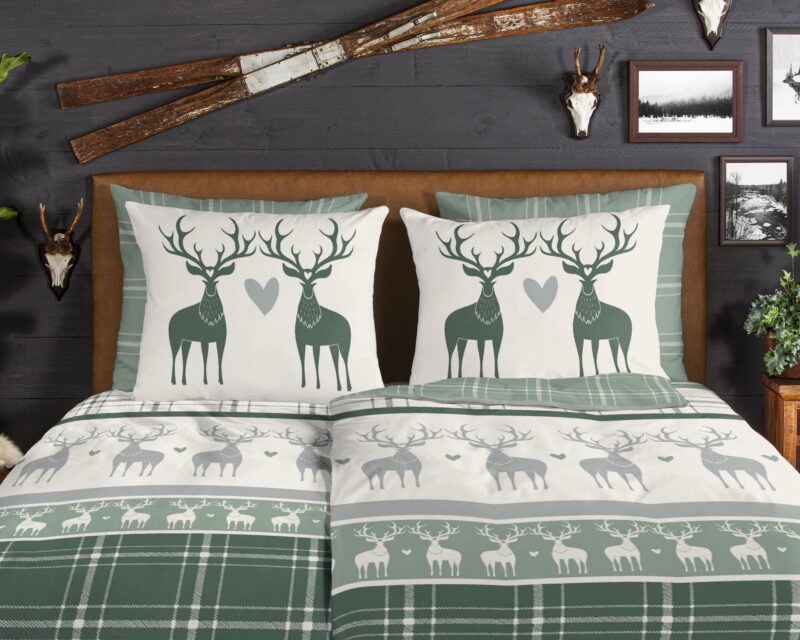 Flanellen dekbedovertrek “Bjirk” van Good Morning met rendieren, in de kleur “Groen” is gemaakt van 100% geruwde 100% katoen/flanel. Doordat het katoen licht opgeruwd is, ontstaat er een zacht laagje. Deze warme, zachte stof is ademend en vochtabsorberend. Dit mooie dekbedovertrek fleurt iedere slaapkamer op en is uitermate geschikt voor de koude wintermaanden.
