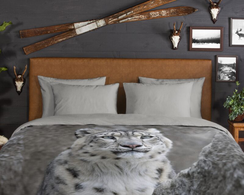 Flanellen dekbedovertrek “Chief” van Good Morning met wit sneeuwluipaard, in de kleur “Grijs” is gemaakt van 100% geruwde 100% katoen/flanel. Doordat het katoen licht opgeruwd is, ontstaat er een zacht laagje. Deze warme, zachte stof is ademend en vochtabsorberend. Dit mooie dekbedovertrek fleurt iedere slaapkamer op en is uitermate geschikt voor de koude wintermaanden.