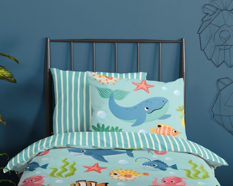 Dekbedovertrek “Ocean” van Good Morning met zeedieren, in de kleur “Aqua” is gemaakt van 100% katoen. Deze kwaliteit is ademend, vochtabsorberend en voelt zacht en soepel aan. Dit mooie dekbedovertrek fleurt iedere slaapkamer op en is geschikt voor ieder jaargetijde. Het katoenen dekbedovertrek is heerlijk koel in de zomer en geeft warmte in de winter.