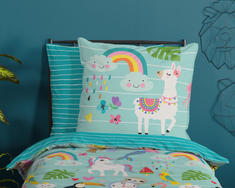 Good Morning Kinderdekbedovertrek “dieren en regenbogen” – Aqua – (135×200 cm) – Katoen