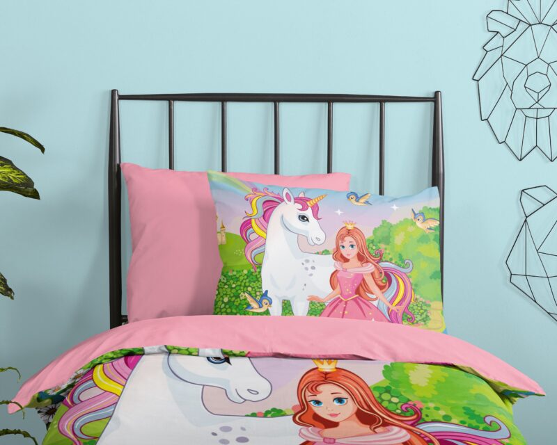 Kinderdekbedovertrek “Fairytale” van Good Morning met eenhoorn en prinses, in de kleur “Multi” is gemaakt van 100% katoen. Deze kwaliteit is ademend, vochtabsorberend en voelt zacht en soepel aan. Dit leuke kinderdekbedovertrek is een toevoeging aan iedere kinderkamer en is geschikt voor ieder jaargetijde. Het katoenen dekbedovertrek is heerlijk koel in de zomer en geeft warmte in de winter.