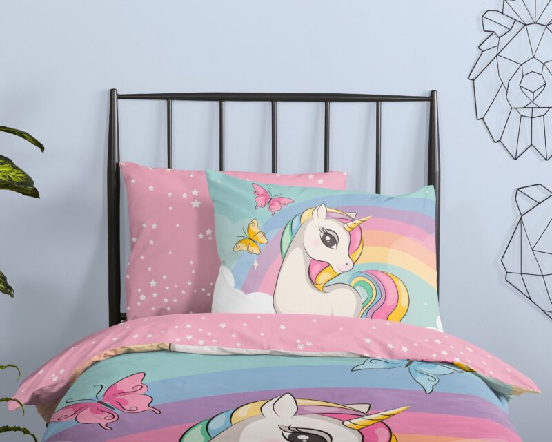 Kinderdekbedovertrek “Dash” van Good Morning met eenhoorn en regenboog, in de kleur “Multi” is gemaakt van 100% katoen. Deze kwaliteit is ademend, vochtabsorberend en voelt zacht en soepel aan. Dit leuke kinderdekbedovertrek is een toevoeging aan iedere kinderkamer en is geschikt voor ieder jaargetijde. Het katoenen dekbedovertrek is heerlijk koel in de zomer en geeft warmte in de winter.