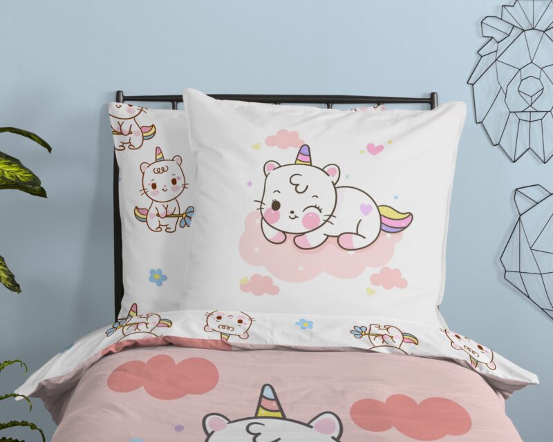 Kinderdekbedovertrek “Puk” van Good Morning met eenhoorn kat met regenboog, in de kleur “Roze” is gemaakt van 100% katoen. Deze kwaliteit is ademend, vochtabsorberend en voelt zacht en soepel aan. Dit leuke kinderdekbedovertrek is een toevoeging aan iedere kinderkamer en is geschikt voor ieder jaargetijde. Het katoenen dekbedovertrek is heerlijk koel in de zomer en geeft warmte in de winter.