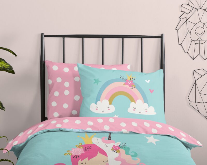 Kinderdekbedovertrek “Heaven” van Good Morning met eenhoorn met regenboog, in de kleur “Multi” is gemaakt van 100% katoen. Deze kwaliteit is ademend, vochtabsorberend en voelt zacht en soepel aan. Dit leuke kinderdekbedovertrek is een toevoeging aan iedere kinderkamer en is geschikt voor ieder jaargetijde. Het katoenen dekbedovertrek is heerlijk koel in de zomer en geeft warmte in de winter.