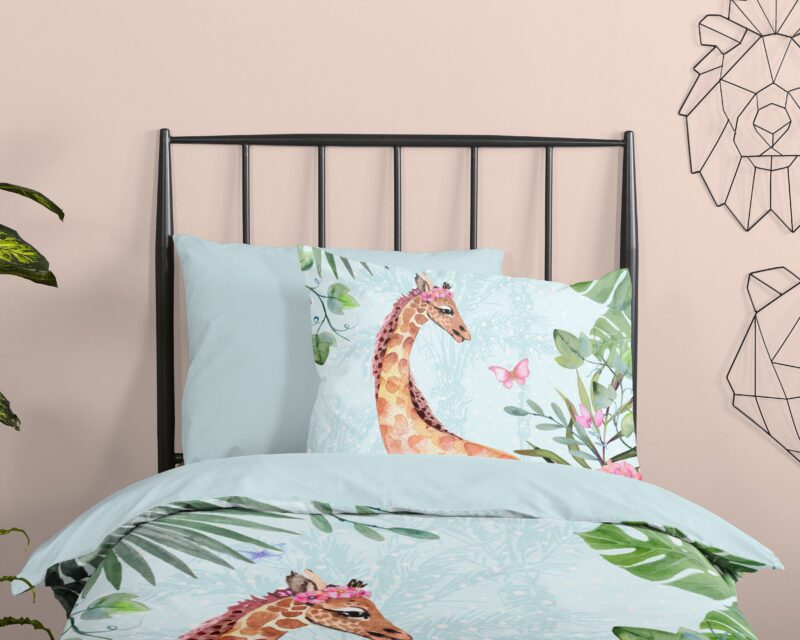 Kinderdekbedovertrek “Desiree” van Good Morning met giraf, in de kleur “Aqua” is gemaakt van 100% katoen. Deze kwaliteit is ademend, vochtabsorberend en voelt zacht en soepel aan. Dit leuke kinderdekbedovertrek is een toevoeging aan iedere kinderkamer en is geschikt voor ieder jaargetijde. Het katoenen dekbedovertrek is heerlijk koel in de zomer en geeft warmte in de winter.
