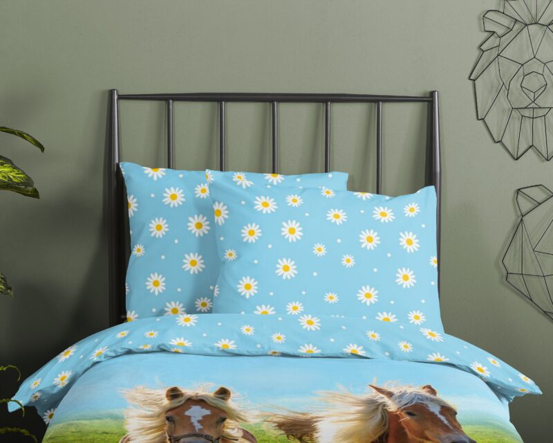 Kinderdekbedovertrek “Horses” van Good Morning met Haflinger paarden, in de kleur “Multi” is gemaakt van 100% katoen. Deze kwaliteit is ademend, vochtabsorberend en voelt zacht en soepel aan. Dit leuke kinderdekbedovertrek is een toevoeging aan iedere kinderkamer en is geschikt voor ieder jaargetijde. Het katoenen dekbedovertrek is heerlijk koel in de zomer en geeft warmte in de winter.