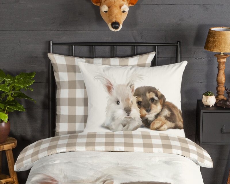 Flanellen Kinderdekbedovertrek “Cute” van Good Morning met hond en konijn, in de kleur “Zand” is gemaakt van 100% geruwde 100% katoen/flanel. Doordat het katoen licht opgeruwd is, ontstaat er een zacht laagje. Deze warme, zachte stof is ademend en vochtabsorberend. Dit leuke kinderdekbedovertrek is een toevoeging aan iedere kinderkamer en is uitermate geschikt voor de koude wintermaanden.