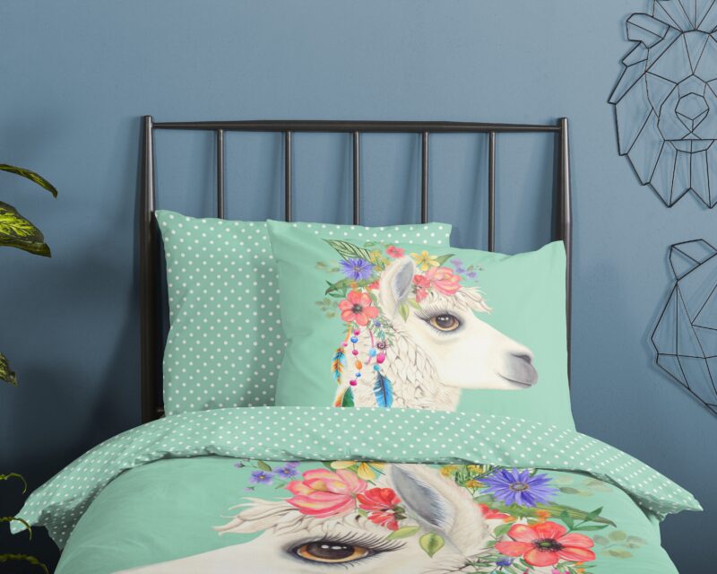 Kinderdekbedovertrek “Joey” van Good Morning met lama, in de kleur “Mint” is gemaakt van 100% katoen. Deze kwaliteit is ademend, vochtabsorberend en voelt zacht en soepel aan. Dit leuke kinderdekbedovertrek is een toevoeging aan iedere kinderkamer en is geschikt voor ieder jaargetijde. Het katoenen dekbedovertrek is heerlijk koel in de zomer en geeft warmte in de winter.