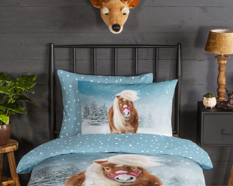 Flanellen Kinderdekbedovertrek “Sweet” van Good Morning met paard in de sneeuw, in de kleur “Multi” is gemaakt van 100% geruwde 100% katoen/flanel. Doordat het katoen licht opgeruwd is, ontstaat er een zacht laagje. Deze warme, zachte stof is ademend en vochtabsorberend. Dit leuke kinderdekbedovertrek is een toevoeging aan iedere kinderkamer en is uitermate geschikt voor de koude wintermaanden.