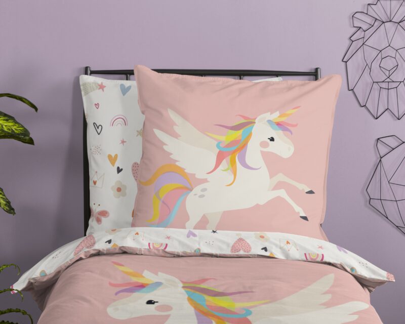 Kinderdekbedovertrek “Unicorn” van Good Morning met regenboog eenhoorn, in de kleur “Multi” is gemaakt van 100% katoen. Deze kwaliteit is ademend, vochtabsorberend en voelt zacht en soepel aan. Dit leuke kinderdekbedovertrek is een toevoeging aan iedere kinderkamer en is geschikt voor ieder jaargetijde. Het katoenen dekbedovertrek is heerlijk koel in de zomer en geeft warmte in de winter.
