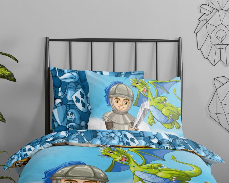 Kinderdekbedovertrek “Knight” van Good Morning met ridder met kasteel en draak, in de kleur “Multi” is gemaakt van 100% katoen. Deze kwaliteit is ademend, vochtabsorberend en voelt zacht en soepel aan. Dit leuke kinderdekbedovertrek is een toevoeging aan iedere kinderkamer en is geschikt voor ieder jaargetijde. Het katoenen dekbedovertrek is heerlijk koel in de zomer en geeft warmte in de winter.