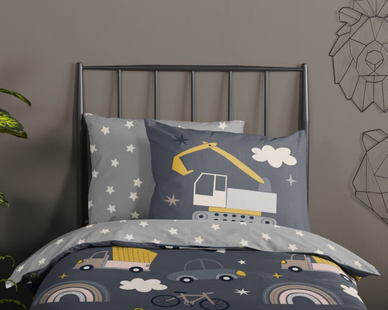 Good Morning Kinderdekbedovertrek “Werkvoertuigen” – Grijs – (140×200/220 cm) – Katoen
