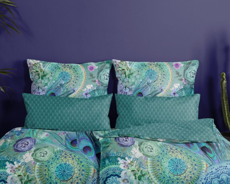 Satijnen dekbedovertrek “Kari” van HIP. Dit luxe dekbedovertrek met mandala’s en veren, in de kleur “Groen” is een dekbedovertrek dat opvalt. Hip dekbedovertrekken zijn kleurrijk en uniek! Aan de achterkant van een Hip dekbedovertrek zit altijd een leuke, bijpassende print. Een dekbedovertrek van Hip fleurt iedere slaapkamer op!