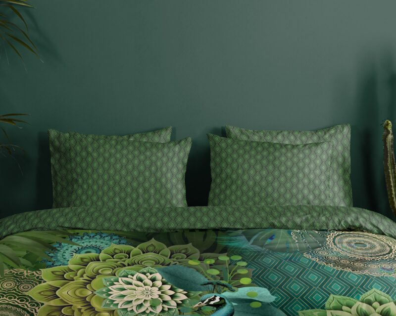 Satijnen dekbedovertrek “Agatha” van HIP. Dit luxe dekbedovertrek met mandalas & pauw, in de kleur “Groen” is een dekbedovertrek dat opvalt. Hip dekbedovertrekken zijn kleurrijk en uniek! Aan de achterkant van een Hip dekbedovertrek zit altijd een leuke, bijpassende print. Een dekbedovertrek van Hip fleurt iedere slaapkamer op!