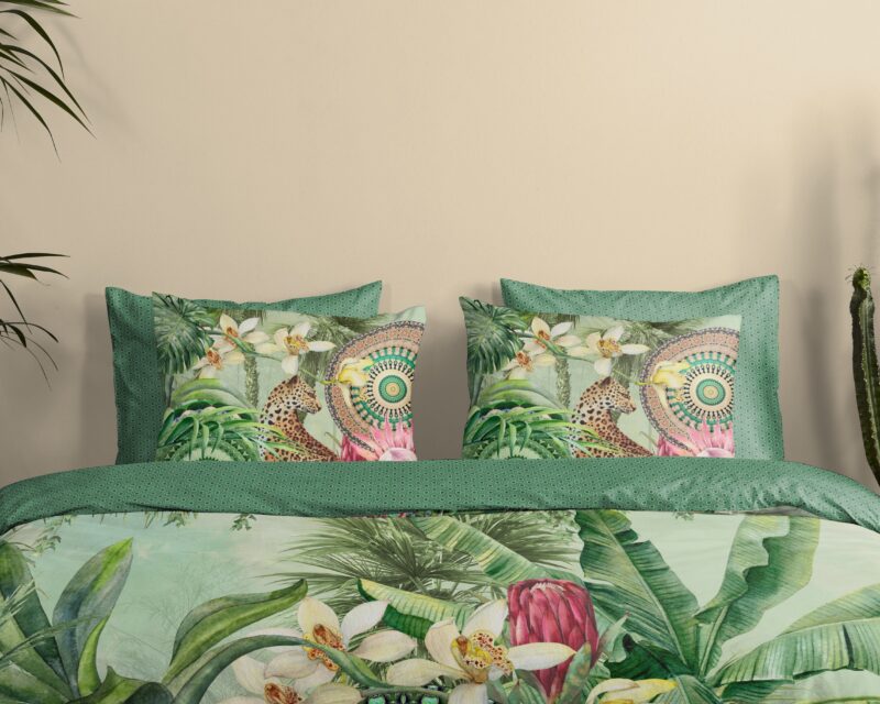Satijnen dekbedovertrek “Abhita” van HIP. Dit luxe dekbedovertrek met tropische print en mandala’s, in de kleur “Groen” is een dekbedovertrek dat opvalt. Hip dekbedovertrekken zijn kleurrijk en uniek! Aan de achterkant van een Hip dekbedovertrek zit altijd een leuke, bijpassende print. Een dekbedovertrek van Hip fleurt iedere slaapkamer op!