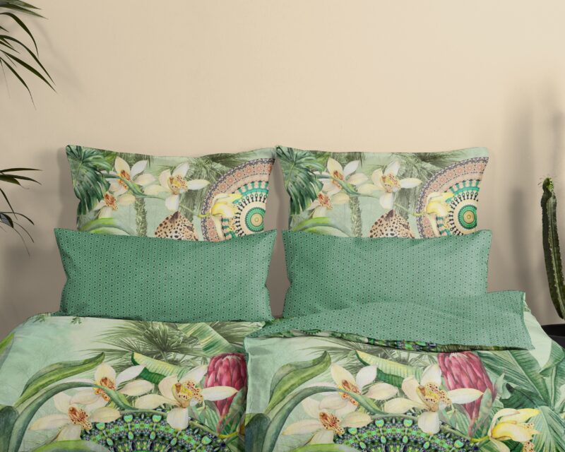 Satijnen dekbedovertrek “Abhita” van HIP. Dit luxe dekbedovertrek met tropische print en mandala’s, in de kleur “Groen” is een dekbedovertrek dat opvalt. Hip dekbedovertrekken zijn kleurrijk en uniek! Aan de achterkant van een Hip dekbedovertrek zit altijd een leuke, bijpassende print. Een dekbedovertrek van Hip fleurt iedere slaapkamer op!