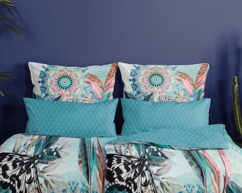 Satijnen kussensloop “Maximilian” van HIP. Dit kussensloop met mandala’s en bloemen, in de kleur “Aqua” is een kussensloop dat perfect past bij het bijbehorende Hip dekbedovertrek “Maximilian”. Het kussensloop is zelfs gemaakt van de print dat aan de achterkant van het Hip dekbedovertrek zit.