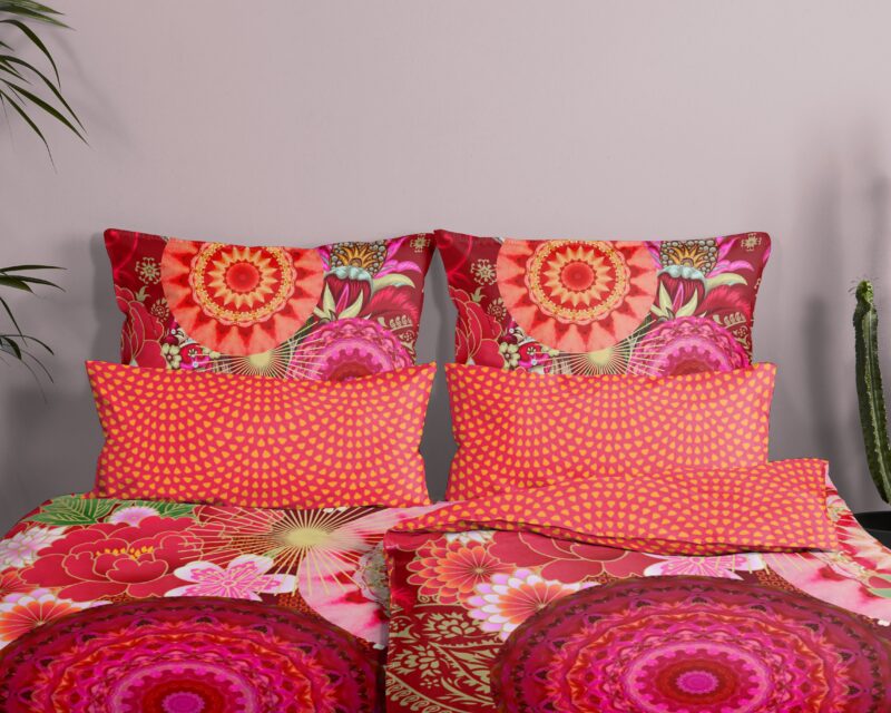 Satijnen kussensloop “Yuki” van HIP. Dit kussensloop met mandala’s en bloemen, in de kleur “Rood” is een kussensloop dat perfect past bij het bijbehorende Hip dekbedovertrek “Yuki”. Het kussensloop is zelfs gemaakt van de print dat aan de achterkant van het Hip dekbedovertrek zit.