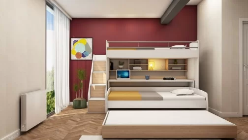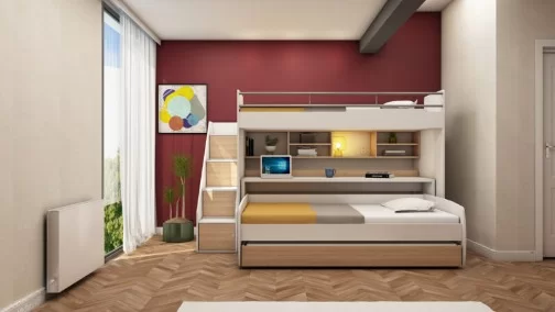 Deze set, stapelbed Icon, maakt van een kleine ruimte een volledige slaap- werkkamer. De set bestaat uit een aantal onderdelen welke je allemaal met elkaar kan combineren. Zo is er een bed in het bovenbouwdeel, een los bed dat je onder het (stapelbed) c.q. bed in het bovenbouwdeel kan plaatsen, een bureau en een uitschuifbed – bedlade dat je weer onder het bed plaatst. Zo ontstaat er een slaapplek voor 3 personen. Bij het gebruik van het stapelbed is een losse houten of metalen ladder bij te bestellen. De houten ladder is voorzien van kleine kastjes. De metalen ladder is zowel links als rechts te plaatsen.