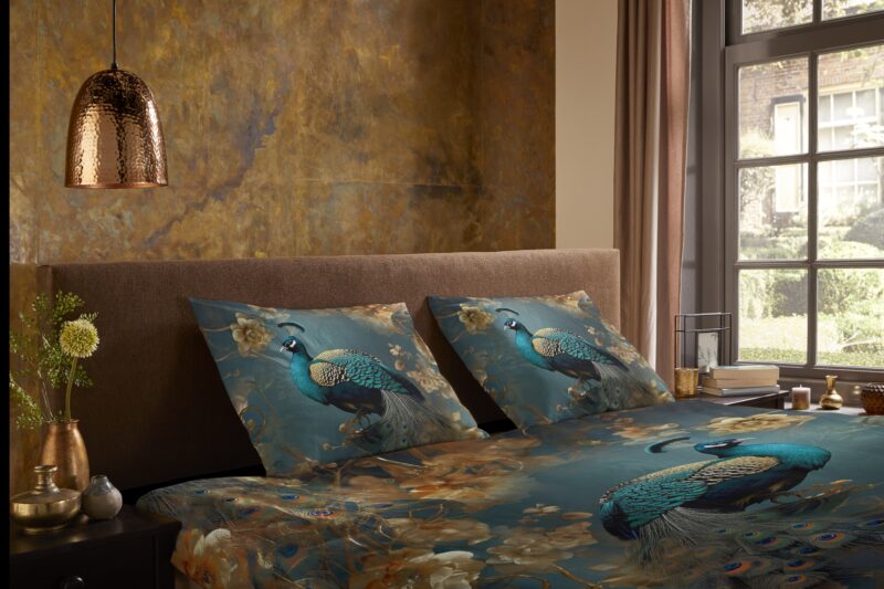 Dekbedovertrek “Savaya” van Pure met pauw met gouden bloemen, in de kleur “Petrol” is gemaakt van 100% polyester/microfiber. Het is een prettige stof, dat soepel om je heen valt en ook nog eens licht van gewicht is. Het is geschikt voor ieder jaargetijde en door de lichte glans heeft het een luxe uitstraling. Na het wassen is deze stof snel droog en kreukt niet tot nauwelijks waardoor strijken (vrijwel) niet nodig is.